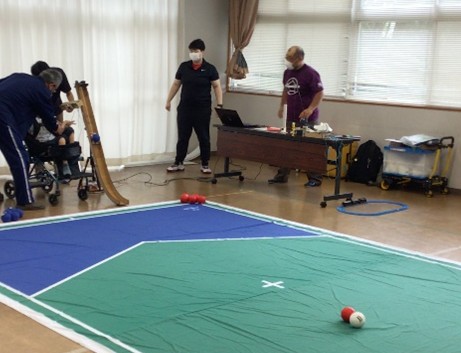 その取組の一環として、障害者パラスポーツである「ボッチャ」を障害の程度にかかわらず、誰もが楽しめるように、徳山工業高等専門学校の支援技術チームが開発された装置を活用させていただき、指導を受けながら中学部で授業を実施しました。