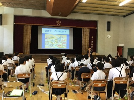 6月に6年生を対象として、岩国税務署長さんをはじめ、岩国法人会の方々にお越しいただき、租税教室を行いました。「もし税金がなかったらどんな社会になるのか」についてDVDを鑑賞するとともに、税金の大切さやその使い道をどう決めるかなど、社会参画することの大切さについてしっかりと学びを深めることができました。(岩国市立灘小学校)