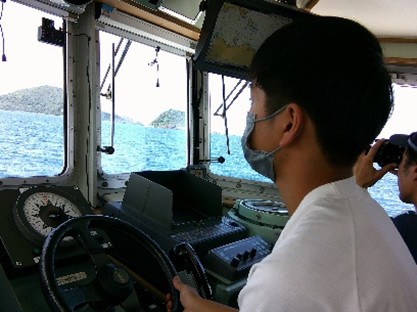 巡視船に乗船し、仙崎湾にある灯台に連れて行っていただきました。巡視船の操船をさせていただきましたが、思うようにかじ取りがいかず、とても難しかったです。巡視船に乗船して乗組員の方の動きを観察していると、乗組員の方が常に周囲の状況を双眼鏡や目視で観察していて、ぶつかりそうな岩がないか、救助を求めている人がいないか注意していると聞きました。集中して周りを見ていないと助けを求めている人に気づかなかったり事故が起きたりするので、常に周囲の情報に気を配ることが大切だと知りました。(長門市立日置中学校)