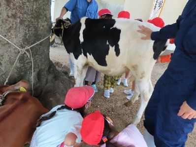 牛乳からバターを作る加工体験や模擬搾乳体験、子牛とのふれあい体験を行ったり、酪農家の方からお話を聞いたりして、畜産についての関心を深めました。